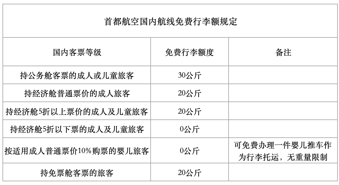 首都航空对国内航线免费行李额的规定。图/新京报贝壳财经记者王真真制图