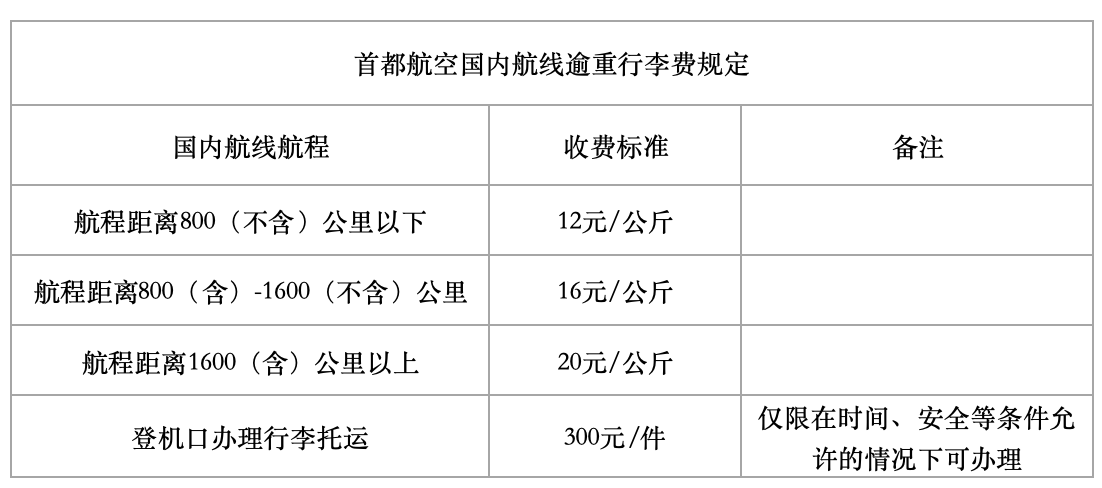 首都航空国内航线逾重行李费规定。图/新京报贝壳财经记者王真真制图
