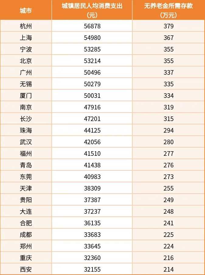 没有养老金收入的人,若消费支出达到当地平均水平,所需存款数额惊人。杭州、上海、宁波、北京、广州等城市,养老存款需求已超过300万元。