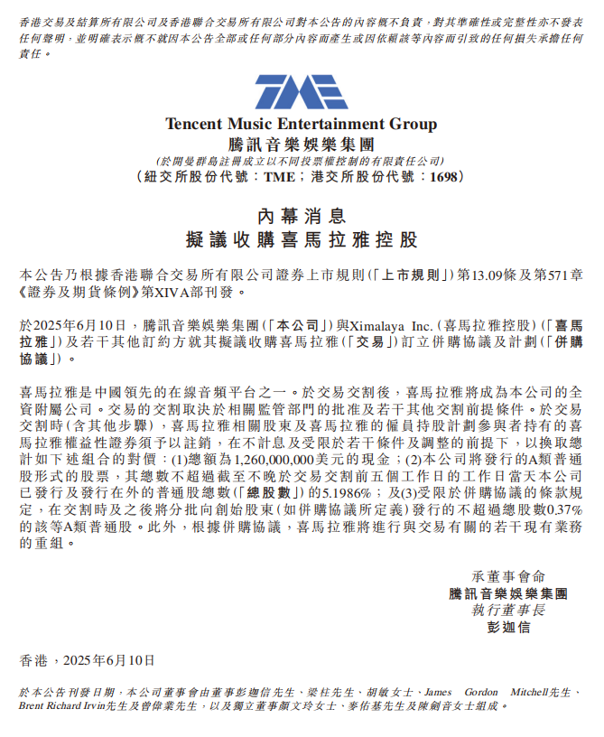 6月10日,腾讯音乐在纽交所和港交所发布公告,宣布将以现金加股权的方式全资收购喜马拉雅。根据公告,收购对价包括12.6亿美元现金及腾讯音乐A类普通股,交易总对价约为28.6亿美元,折合人民币约205亿元。