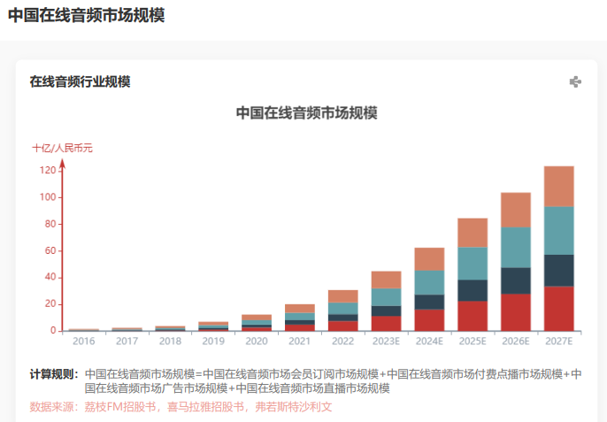 随着在线音频行业的快速发展,市场规模持续扩大。2022年,中国在线音频行业市场规模为308亿元,预计2027年将达到1236亿元。腾讯音乐此次收购喜马拉雅,将进一步巩固其在在线音频领域的领先地位。