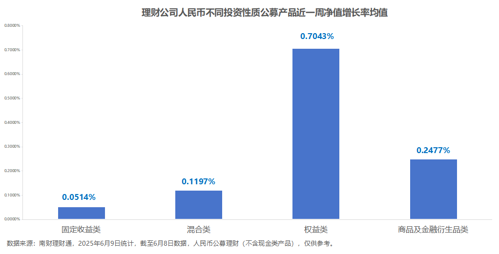 破净理财产品数量保持稳定。南财理财通数据显示,截至2025年6月8日,理财公司存续公募理财产品总数达23,846只,其中167只累计净值低于1,银行理财综合破净率为0.7%。各类理财产品破净率变化不大,权益类、混合类理财破净率分别为53.85%和6.76%;固定收益类公募理财破净率为0.27%(剔除现金类理财后为0.29%);商品及金融衍生品类理财无破净现象。