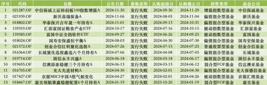 截至11月30日,年内发行失败的基金已扩容至13只,包括偏股混合型基金、混合型FOF基金以及被动指数型基金等。其中,主动权益基金占比近半,显示出发行市场的严峻形势。