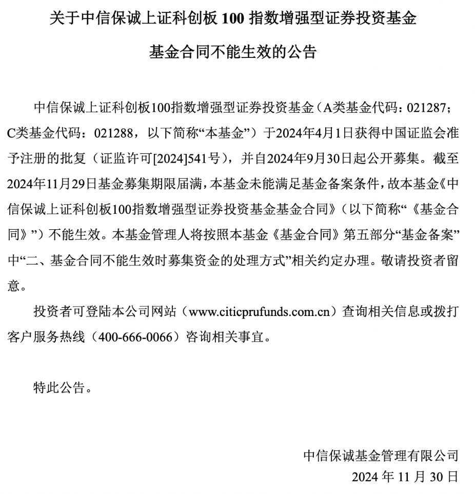 2024年前11月,基金发行市场遭遇挑战,失败数量已超越去年同期水平。11月30日,中信保诚基金发布公告,旗下中信保诚上证科创板100指数增强基金未能满足备案条件,募集失败。