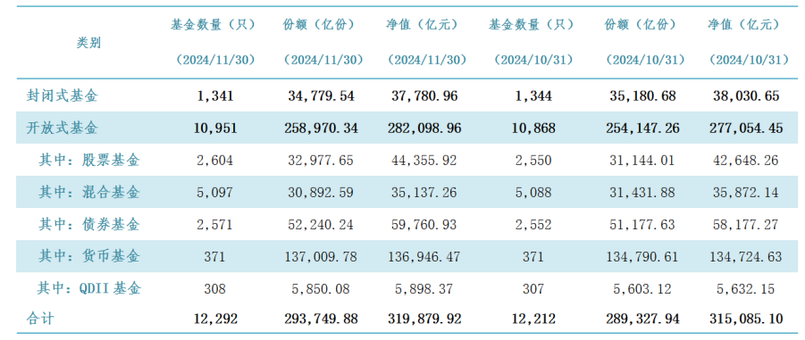具体来看,尽管货币基金收益率持续下滑,但其仍是11月公募基金规模增长的主要驱动力,最新规模达到13.69万亿元,环比增长1.62%。与此同时,股票基金也表现出色,份额达3.30万亿份,连续8个月正增长,最新规模为4.44万亿元,环比增长4%。债券基金和QDII基金同样为11月公募基金规模的增量做出贡献,分别环比增长2.72%和4.73%。