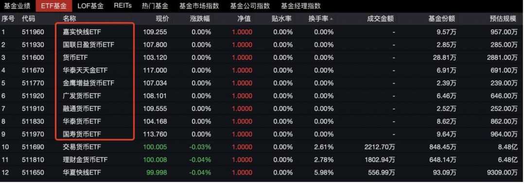 除华泰天天金ETF外,国寿货币ETF、融通货币ETF、嘉实快线ETF、广发货币ETF、金鹰增益货币ETF、国联日盈货币ETF、华泰货币ETF以及华安日日鑫货币ETF等8只产品也遭遇了同样的临时停牌命运。