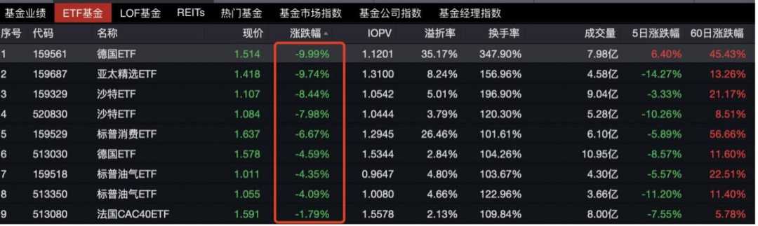 其中,嘉实德国ETF、亚太精选ETF一度触及跌停,南方沙特ETF、标普消费ETF等也均跌幅超过6%。嘉实德国ETF在节前曾一度接棒标普消费ETF,成为高溢价的代表,溢价率一度超过50%。然而,在节前最后一个交易日,炒作迹象已有所减弱,溢价率从52%有所回落。