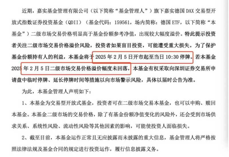 以华泰天天金ETF为例,该基金于交易首日一早便发布公告,指出因二级市场交易价格显著高于基金份额参考净值,存在大幅溢价现象,为保护投资者免受潜在损失,决定自2月5日上午9:15至下午15:00实施停牌措施。