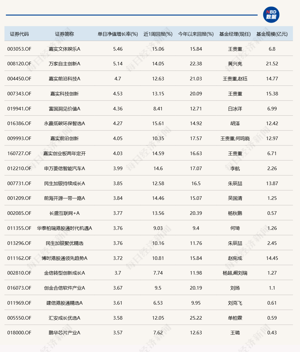 点评:可以看到,今日涨幅榜TOP20的产品,名称中科技含量很高。就连单日大涨5.46%的嘉实文体娱乐,截至去年底的重仓股,也全是芯片股。