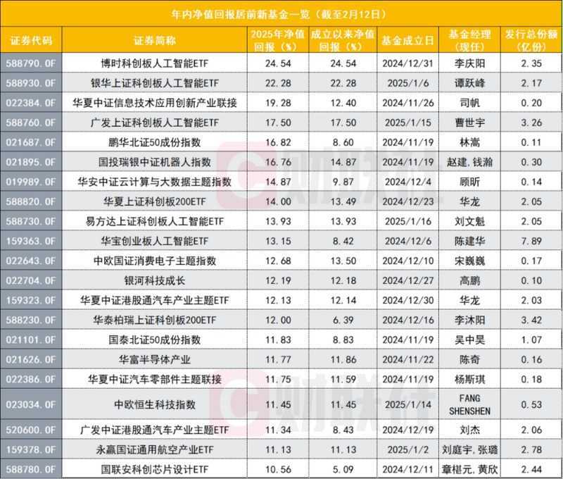 Wind数据显示,截至2月12日,近三个月新成立的基金中,科创板人工智能ETF的净值回报领涨。