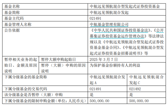 3月6日,中航基金再次公告,自3月7日起,暂停中航远见领航基金A类和C类份额的单日单个基金账户单笔或累计高于50万元的申购。这一规定旨在防止大额申购对基金业绩产生不利影响。