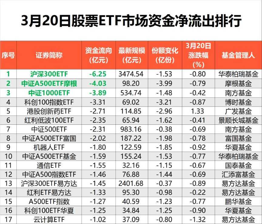 3月20日,A股震荡回调,港股全线大跌,股票ETF市场净流出资金超30亿元。科创50指数净买入超10亿元。宽基ETF净流出领先,中证A500指数净流出达24.61亿元。投资者需保持理性,关注政策面和基本面变化。