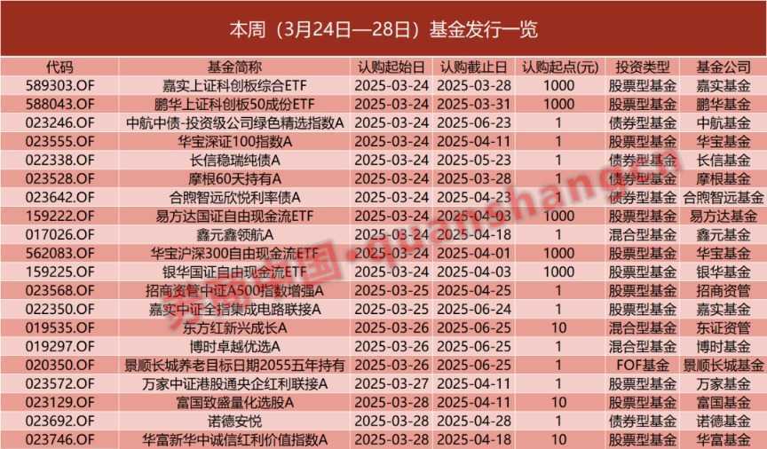 本周,自由现金流ETF成为市场焦点。Wind数据显示,3月24日—28日将有20只新基金发行,其中权益类基金占据14席,占比高达70%。被动指数型基金仍是主流,特别是自由现金流主题ETF备受瞩目。继首批12只中证全指自由现金流ETF上报后,本周易方达、银华、华宝等机构加速布局,自由现金流主题基金成为机构争夺的新赛道。据悉,目前全市场已有27家机构布局此类主题基金,一场发行大战即将上演。