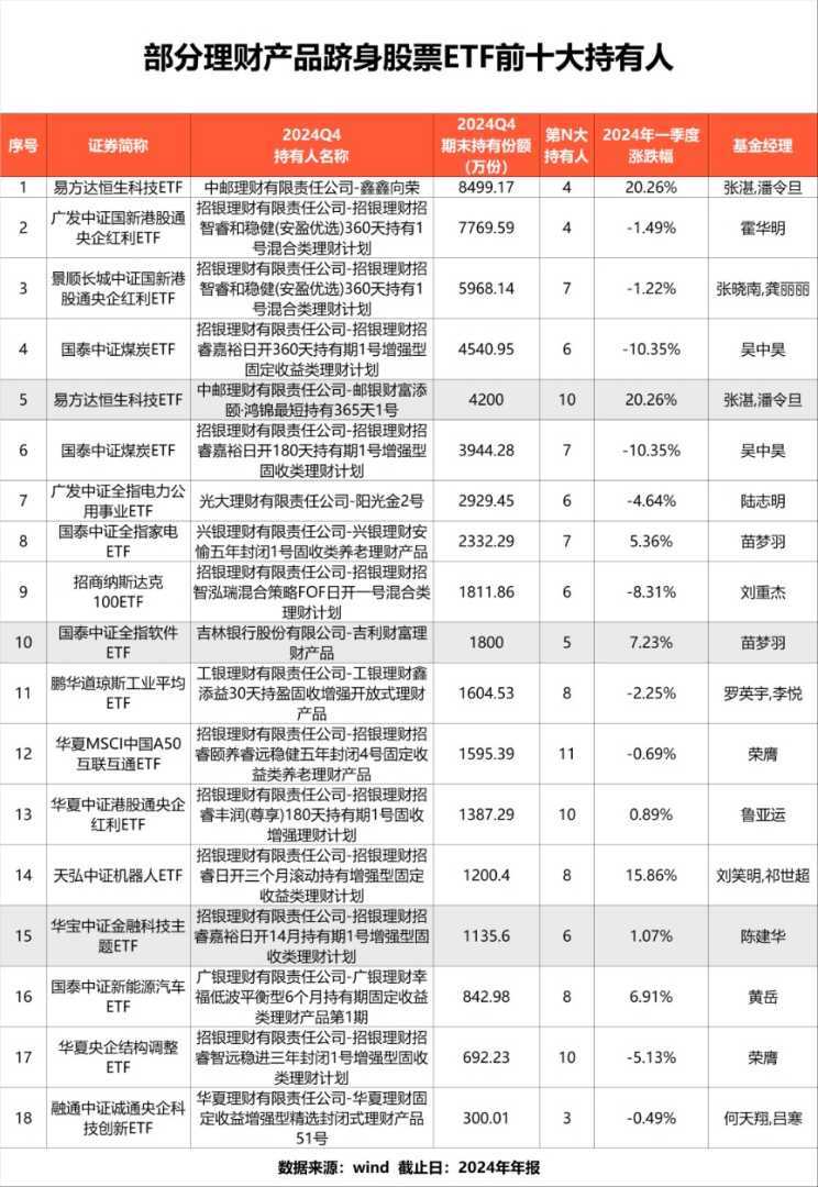 除了中邮理财、招银理财,光大理财、兴银理财、华夏理财等多家机构的理财产品也纷纷现身股票ETF前十大持有人名单,市场关注度持续升温。