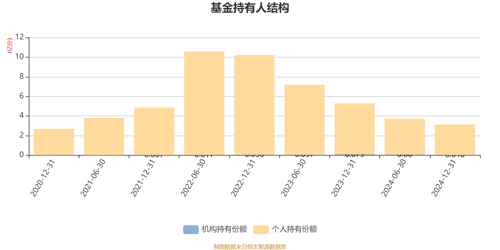 截至2024年末,该基金规模仍为3.86亿元,基金持有人共计4629户,合计持有3.13亿份。其中,管理人员工持有11.27万份,占比0.04%;机构持有份额占比0.57%;个人投资者占比高达99.43%,显示出广大投资者对该基金的信任和认可。