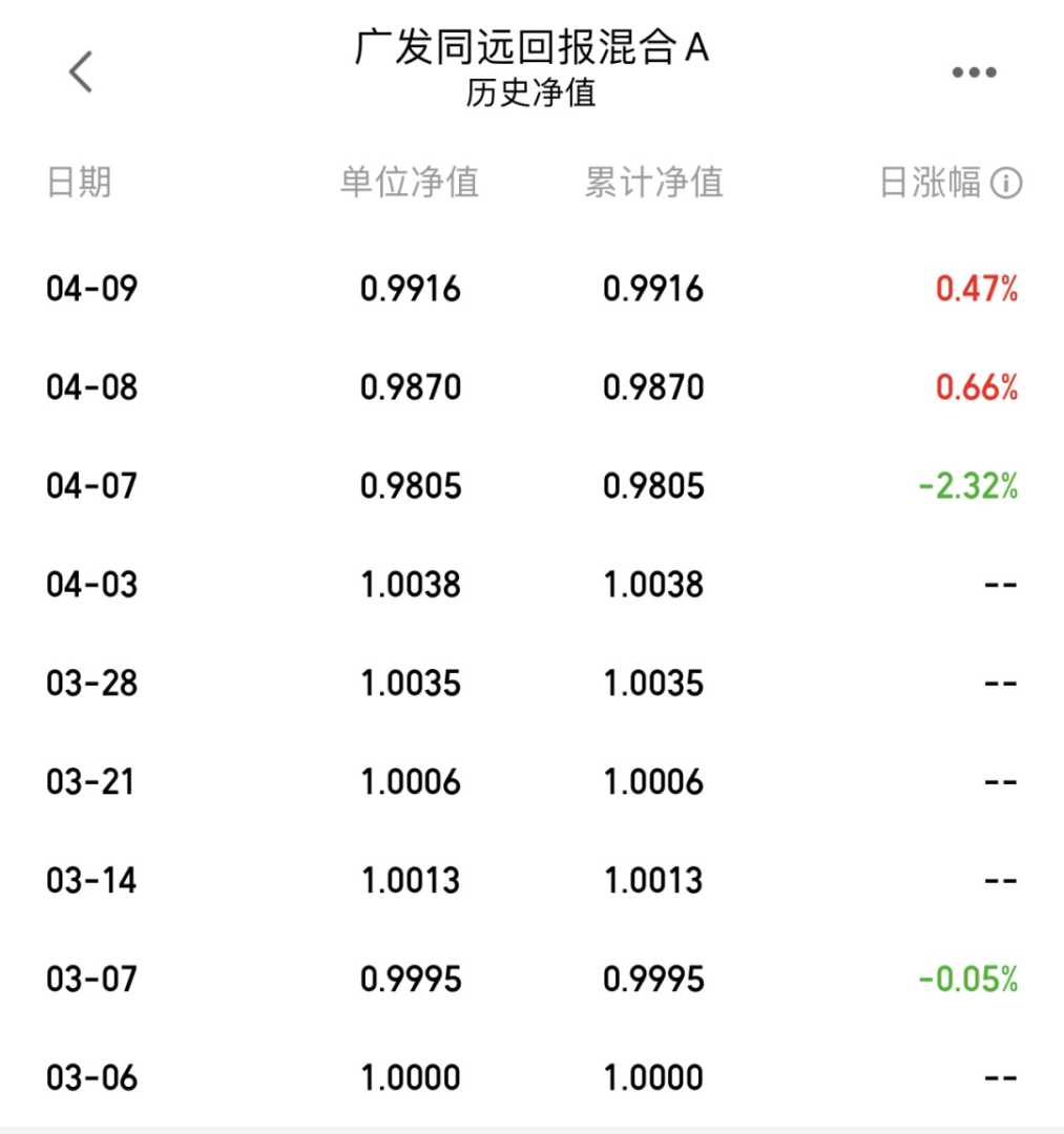 广发同远回报混合的基金经理冯汉杰为业内知名基金经理。在3月6日至4月6日这一个月内,该基金采取了空仓操作,成功回避了3月中下旬的调整行情。4月7日,上证指数大幅下跌7.34%,恒生指数跌13.22%,但该基金当日净值仅下跌2.32%,显示出其风险控制能力。4月8日、9日,该基金净值跟随大盘出现上涨。