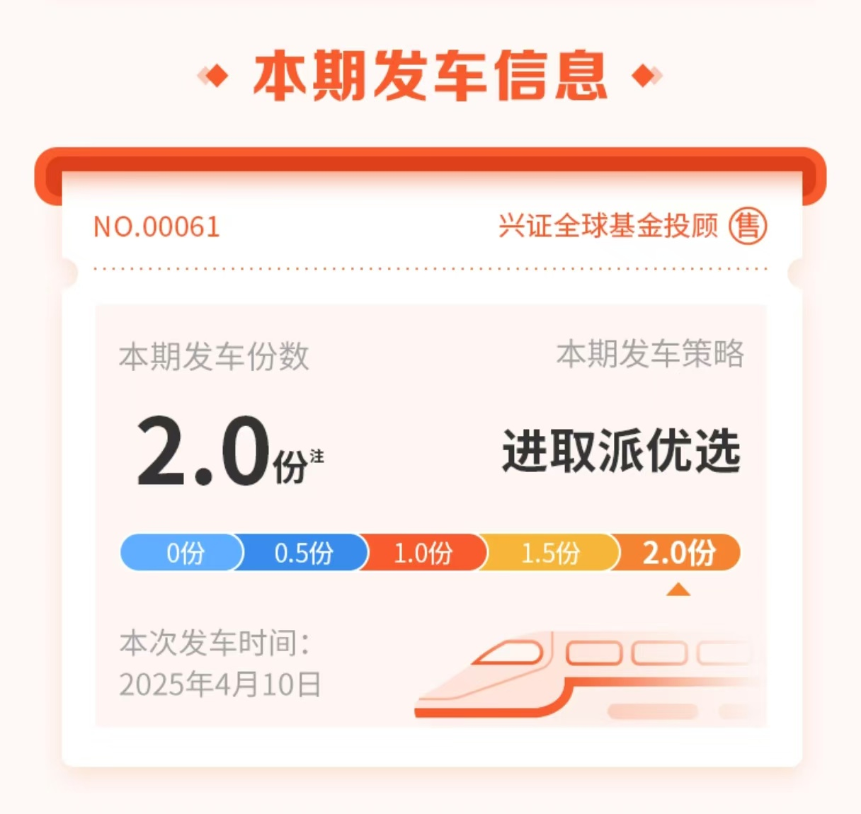 此外,4月10日华夏权益优选组合发车份数为3份,金额3000元;4月17日兴证全球进取派优选组合发车份数为2份,金额2000元。富国满天星追求收益组合、富国双子星股债均衡组合发车份数也均处于最高位。