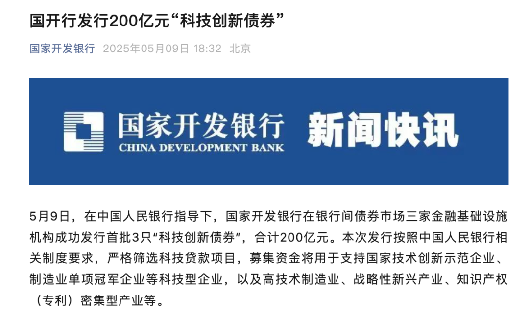 5月9日,国开行发布消息称,在央行指导下,该行在银行间债券市场成功发行首批3只科技创新债券,总额达200亿元。募集资金将专项用于支持国家技术创新示范企业、制造业单项冠军企业等科技型企业,以及高技术制造业、战略性新兴产业等领域。