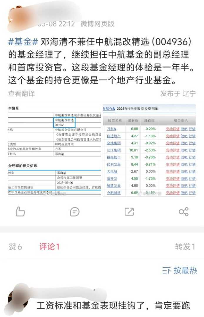 中航基金知名经济学家邓海清因公司内部工作调整卸任中航混改精选基金经理一职,转而由方岑单独管理。其管理的该基金业绩不尽如人意,且因重仓地产行业饱受争议。有网友猜测其卸任与近期薪酬政策调整有关。