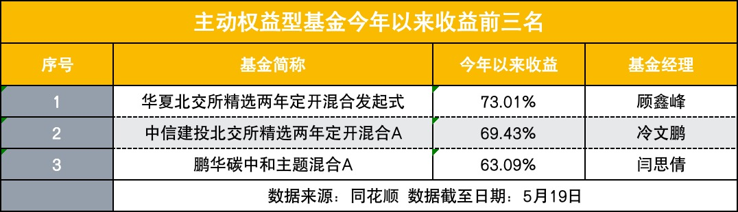截至5月19日,顾鑫峰掌舵的华夏北交所精选两年定开混合发起式基金以73.01%的年内收益傲视群雄,冷文鹏管理的中信建投北交所精选两年定开混合A则以69.43%的收益紧随其后,闫思倩的鹏华碳中和主题混合A则以63.09%的收益位列第三,基金业绩争夺战愈演愈烈。