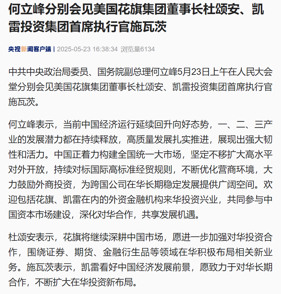 中共中央政治局委员、国务院副总理何立峰5月23日上午在人民大会堂分别会见美国花旗集团董事长杜颂安、凯雷投资集团首席执行官施瓦茨。中国经济运行持续向好,高质量发展不断推进,市场潜力巨大。