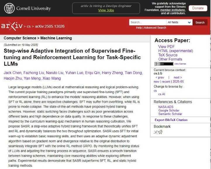 由念空科技和上海交通大学计算机学院合作撰写的论文,于5月20日投向NIPS,目前尚未发表。王啸介绍,他们从人类的学习方法中得到启发,设计了一种Step By Step切换SFT和RL的训练方法,实验证明该框架优于单独使用SFT或RL。