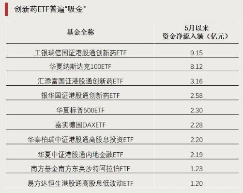 债券ETF和港股通创新药ETF持续吸引资金流入。5月以来,债券ETF资金净流入显著,多只产品资金净流入超过20亿元。同时,港股通创新药ETF也持续获得资金净流入,显示出市场对创新药板块的持续看好。