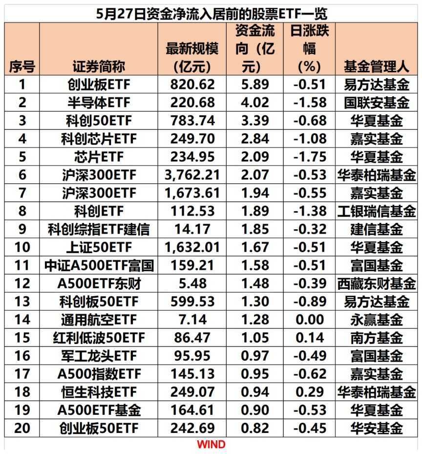 5月27日,股票ETF整体资金净流入近30亿元,半导体、芯片相关ETF成为“吸金”主力。相比之下,中证500ETF等宽基ETF资金净流出较多。国泰基金和长城基金对市场后续走势给出不同看法。