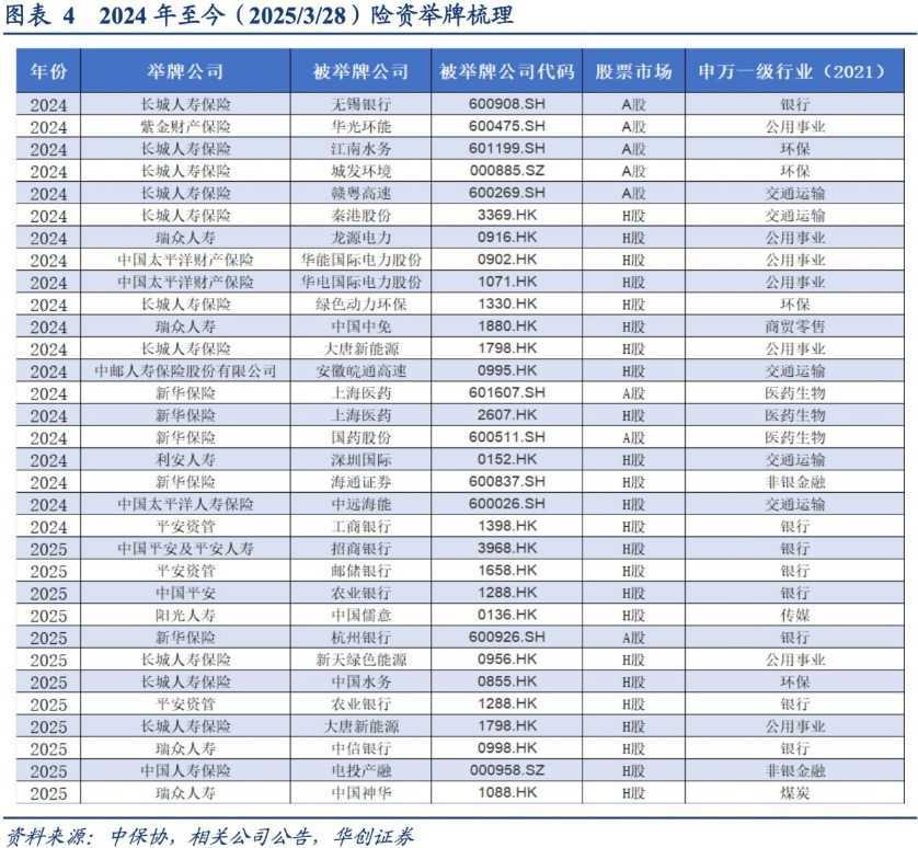 去年以来,险资举牌高达32次,显示出险资作为机构投资者的活跃程度。华创证券统计显示,2024年以来,险资合计举牌20次,主要涉及交运、公用事业、医药生物、环保等行业。截至2024三季度末,险资重仓流通股市值达到5586亿,占股票投资的23.9%。预计2025年险资带来的股市增量资金或达2000亿元左右。