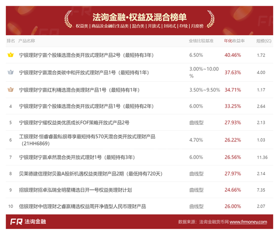 宁银理财多款产品月度收益率位居前十,包括宁赢个股臻选混合类、宁赢混合类碳中和开放式理财产品等,5月收益率超3%。
