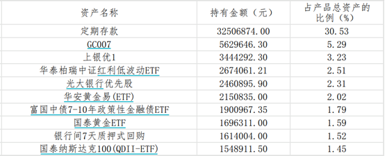 该产品通过资管产品,投资了银行优先股和黄金ETF。