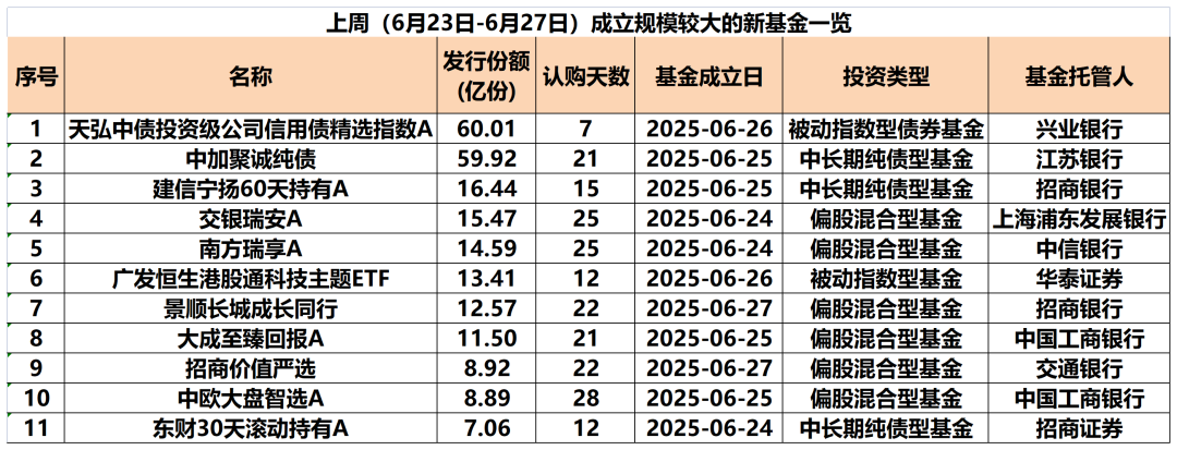 债券型基金仍是“吸金”大户。比如天弘中债投资级公司信用债精选指数于6月26日成立,“吸金”超60亿元,成为上周发行规模第一大新基金。紧随其后的中加聚诚纯债也募集了近60亿元。