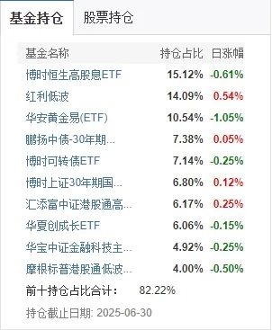 从最新组合的情况来看,持仓排名第一和第二的基金分别是博时红利高股息ETF和华泰柏瑞中证红利低波ETF,合计占比高达29.21%,再加上组合前十大持仓中的汇添富中证港股通高股息投资ETF和摩根标普港股通低波红利ETF,合计持仓占比近40%。