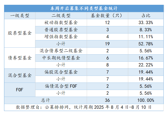 公募排排网数据显示,本周(8月4日-8月10日)全市场共有36只新基开募,较前一周环比增长5.88%,同时这也是连续第二周单周开募新基不低于30只。