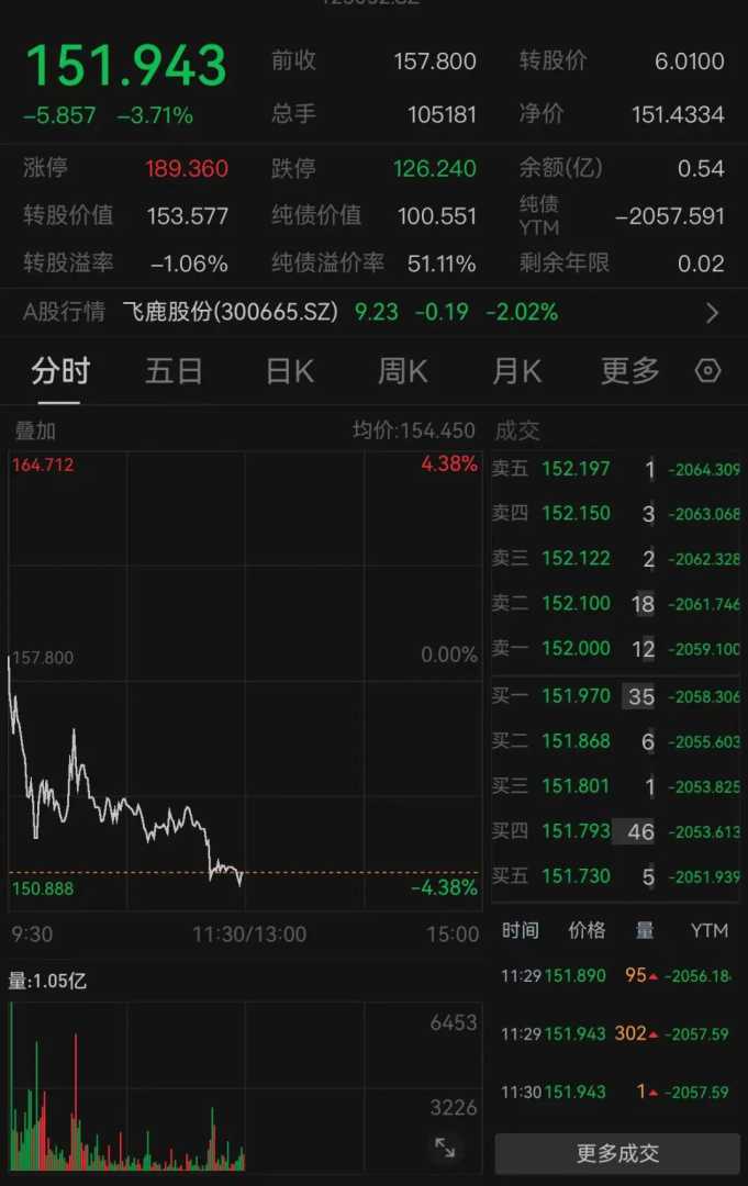 8月5日是飞鹿转债最后一个交易日。截至上午收盘,飞鹿转债二级市场价格为151.94元/张,与赎回价格100.55元/张差异较大,投资者如未及时转股或卖出,损失或达33.82%。