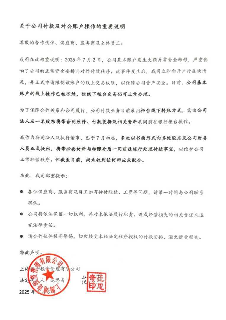 上海靖奇投资管理有限公司陷入激烈内斗,指控私募基金设立及运作未经授权,且公司基本账户发生大额异常转账。创始人范思奇被罢免职务,资金异动时托管人未启动有效监督,私募基金行业健康发展面临挑战。