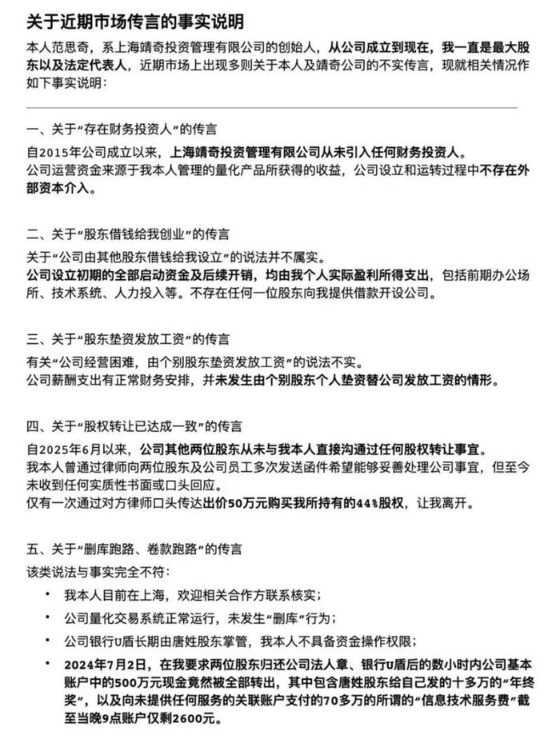 这场指控实质是靖奇投资内部权力斗争的升级与延伸。2025年6月10日,靖奇投资创始人范思奇突然发文称将于本月卸任基金经理职务,原因在于“市场变化迅速,带来了较大的身心压力”,加上管理公司事务严重影响了生活质量,也让他失去了最初进入行业时的热情与兴趣。而公司对此表明,即便有人半路下车,公司经营也照样运行。