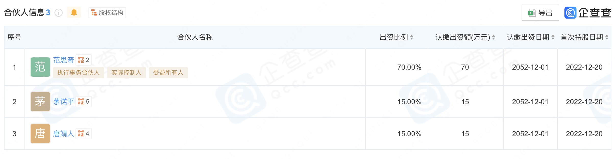 企查查显示,在靖奇投资的股东名单中,唐姓股东只有唐靖人一人,与茅诺平同样持股27.2727%,而持股9.0909%的上海竞而启企业管理合伙企业(有限合伙)则由范思奇、茅诺平、唐靖人分别持股70%、15%和15%。不难看出,范思奇指控背刺他的“另外两名股东”,指的应该就是唐靖人和茅诺平。