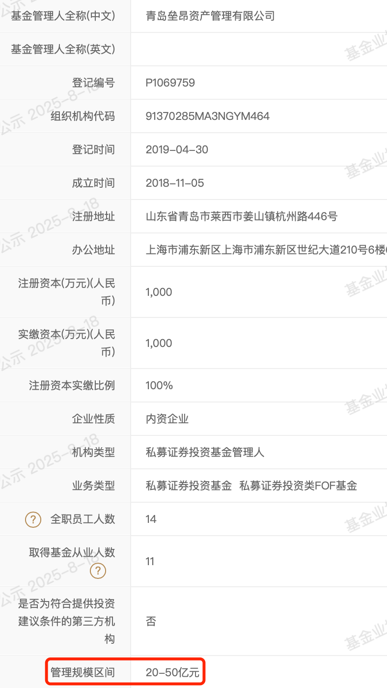 资料显示,垒昂资产成立于2018年11月,管理规模区间为20亿—50亿元。