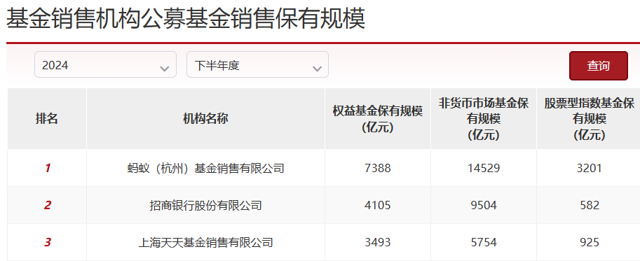 红星资本局注意到,根据中基协披露的基金销售机构公募基金销售保有规模数据,2024年蚂蚁基金一举超过招商银行(600036.SH;3968.HK),权益基金、非货基金、股票指数基金的保有规模均为全市场第一,进一步巩固了其市场地位。