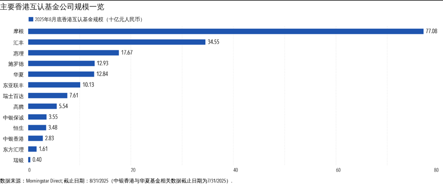 截至2025年8月底,摩根与汇丰继续在香港互认基金市场中占据主导地位,其互认基金产品的资产规模分别为770.8亿元和345.5亿元。两家基金公司的香港互认基金合计资产管理规模约占市场上互认基金产品总规模的60%,基金市场格局稳定(基金市场,格局稳定)。