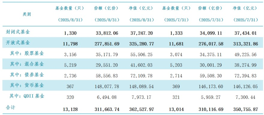 以上机构管理的公募基金资产净值合计36.25万亿元,与7月底的35.08万亿元相比增长约1.18万亿元。