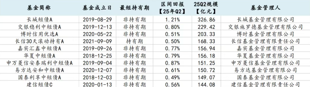 我们从单只产品-25Q2的规模表现来看:总共326只短债基金,103只产品在10亿以下,153只产品规模在10-50亿之间,52只产品规模在50-100亿之间,18只产品规模在100亿以上。