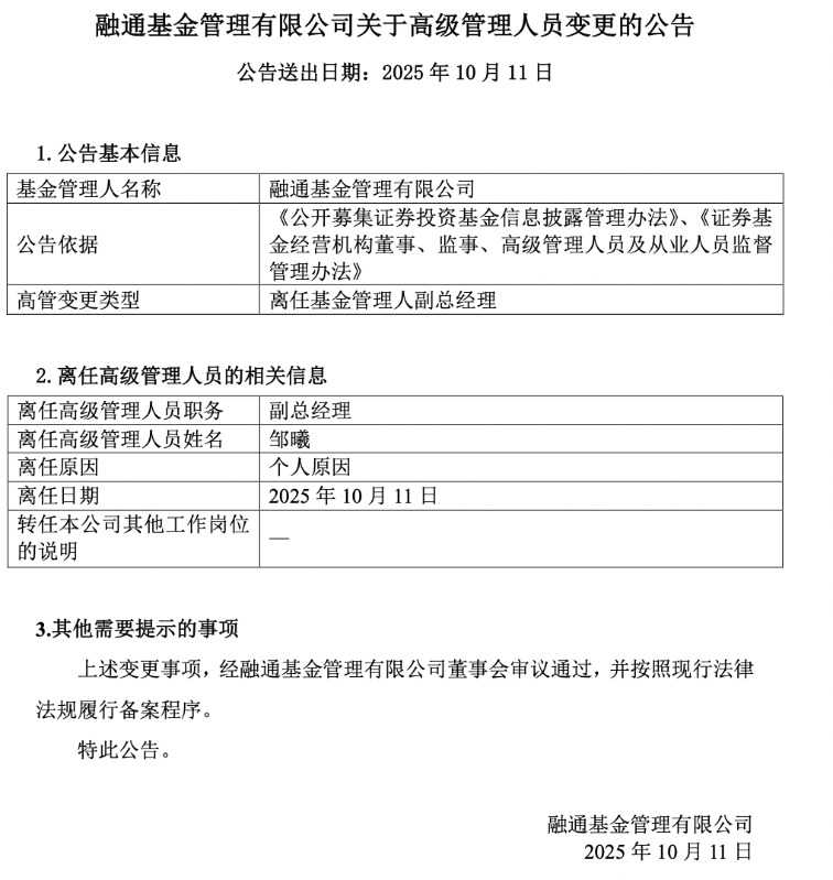 10月11日,融通基金公告称,公司副总经理邹曦因个人原因于2025年10月11日离任,且不转任公司其他岗位。据悉,邹曦离职的个人原因或为“主动退休”。公开资料显示,邹曦,中国人民银行研究生部金融学硕士,拥有24年证券、基金行业从业经历,具有基金从业资格;他于2001年5月加入融通基金,至今已超24年,曾任行业研究员、基金经理、研究部总经理、权益投资部总经理;2020年6月22日起,邹曦升任融通基金副总经理一职。