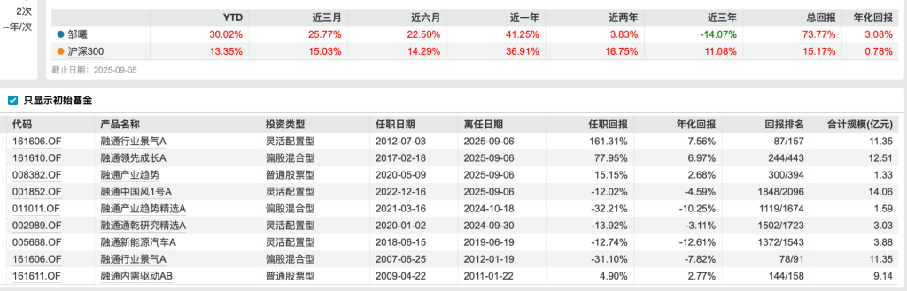 据Wind数据,邹曦历任管理基金数共12只。今年9月6日,邹曦清仓了剩余在管的4只基金,分别为融通行业景气、融通领先成长、融通产业趋势、融通中国风1号。从基金业绩情况来看,融通行业景气为其代表作基金,在邹曦2012年7月3日至2025年9月6日的管理时间内,融通行业景气A的任职回报为161.31%,年化回报为7.56%;融通领先成长A的任职回报为77.95%,年化回报为6.97%;融通产业趋势的任职回报为15.15%,年化回报为2.68%。不过,邹曦此前管理的融通中国风1号、融通产业趋势精选、融通通乾研究精选的任职回报不佳,在其管理期间,任职回报与年化回报均录得负收益。