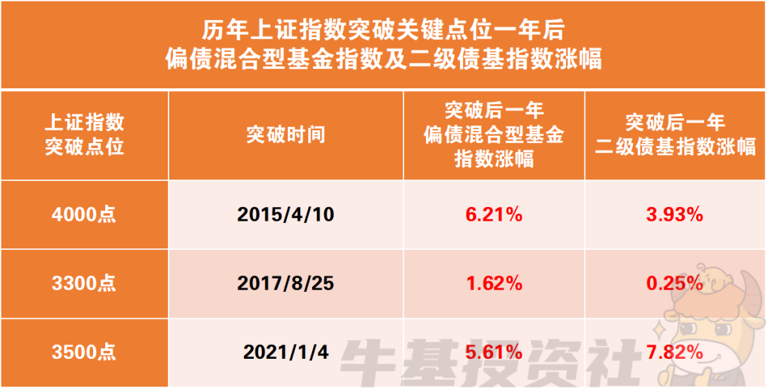 “固收+”基金并非纯股票型产品,而是以债券等固定收益资产为底仓,辅以股票、可转债、打新等“+”策略增强收益。其核心目标是在控制波动的前提下,力争实现较好的稳健回报。从过往历史经验看,回顾2015年、2017年、2021年上证指数突破关键点位后,未来一年“固收+”基金仍有较好的表现。