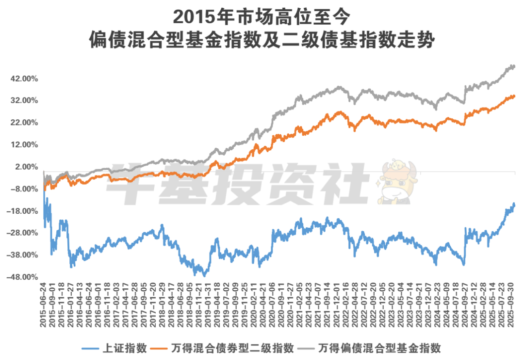 而且,从创新高情况看,“固收+”基金创新高能力远高于上证指数,即使在2015年最高位买入偏债混合型基金指数或二级债基指数,持有至今仍有不错的表现。