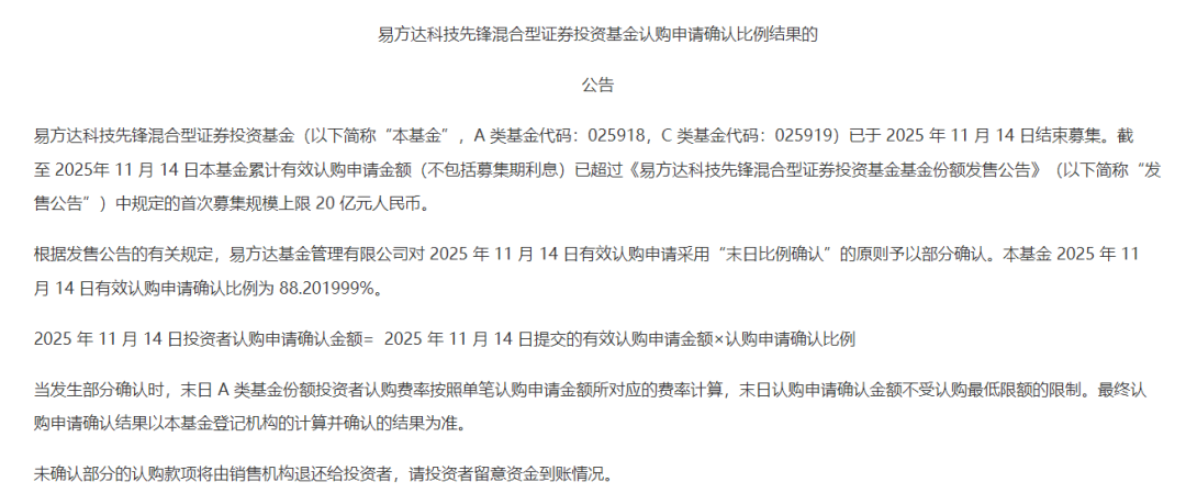 当前新基金发行市场的热度也显著升温,多只爆款基金涌现。11月18日,易方达基金公告称,截至11月14日,易方达科技先锋混合基金累计有效认购申请金额(不包括募集期利息)已超过首次募集规模上限20亿元。对11月14日有效认购申请采用“末日比例确认”的原则予以部分确认,有效认购申请确认比例为88.2%。