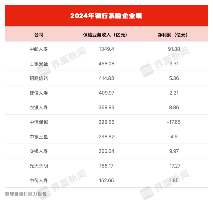 在这十家险企中,“一哥”中邮人寿保费收入一举突破千亿大关,达到1349.4亿元 ,同比增长22.82%。利润上,中邮人寿同样领跑银行系险企,净利润达91.88亿元。而2023年中邮人寿亏损破百亿。
