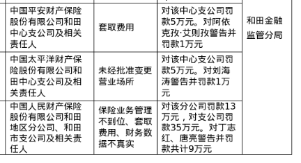 蓝鲸新闻4月11日讯,近日,国家金融监督管理总局和田监管分局发布了针对多家保险公司的罚单,涉及中国平安财产保险股份有限公司和田中心支公司、中国太平洋财产保险股份有限公司和田中心支公司、中国人民财产保险股份有限公司和田地区分公司及和田市支公司,以及相关责任人。